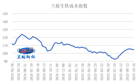 2025年第41周(10.6-10.10)兰格生铁成本指数为104.3,较上周降0.7%。