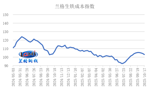 2025年第42周(10.13-10.17)兰格生铁成本指数为103.2,较上周降1.0%。