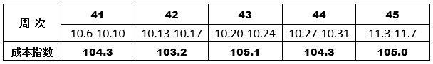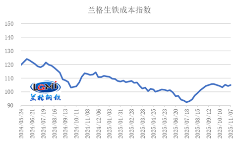 2025年第45周(11.3-11.7)兰格生铁成本指数为105.0,较上周升0.6%。