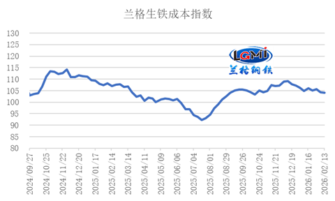 2026年第7周(2.9-2.13)兰格生铁成本指数为104.1,较上周降0.2%。