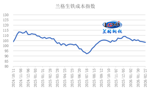 2026年第9周(2.23-2.27)兰格生铁成本指数为103.4,较上周降0.3%。